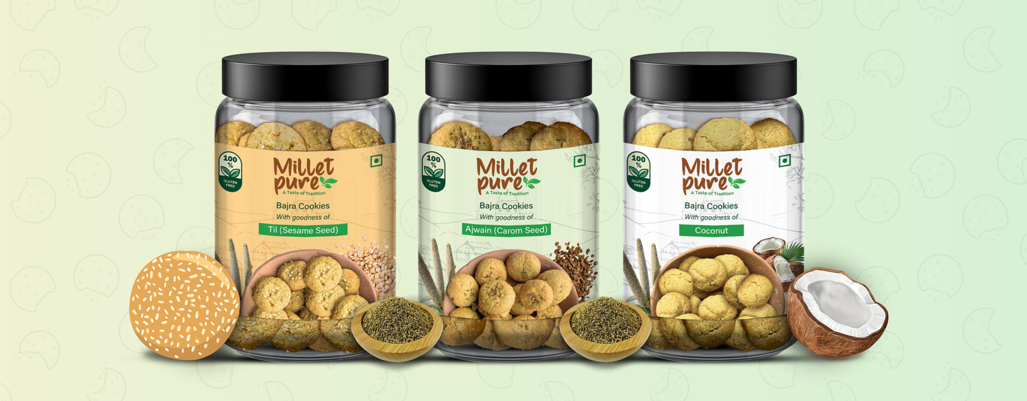 Millet Pure offers gluten-free millet snacks made without maida, artificial additives. Rich in iron and zinc, our cookies and Kurkure deliver wholesome nutrition with every bite.